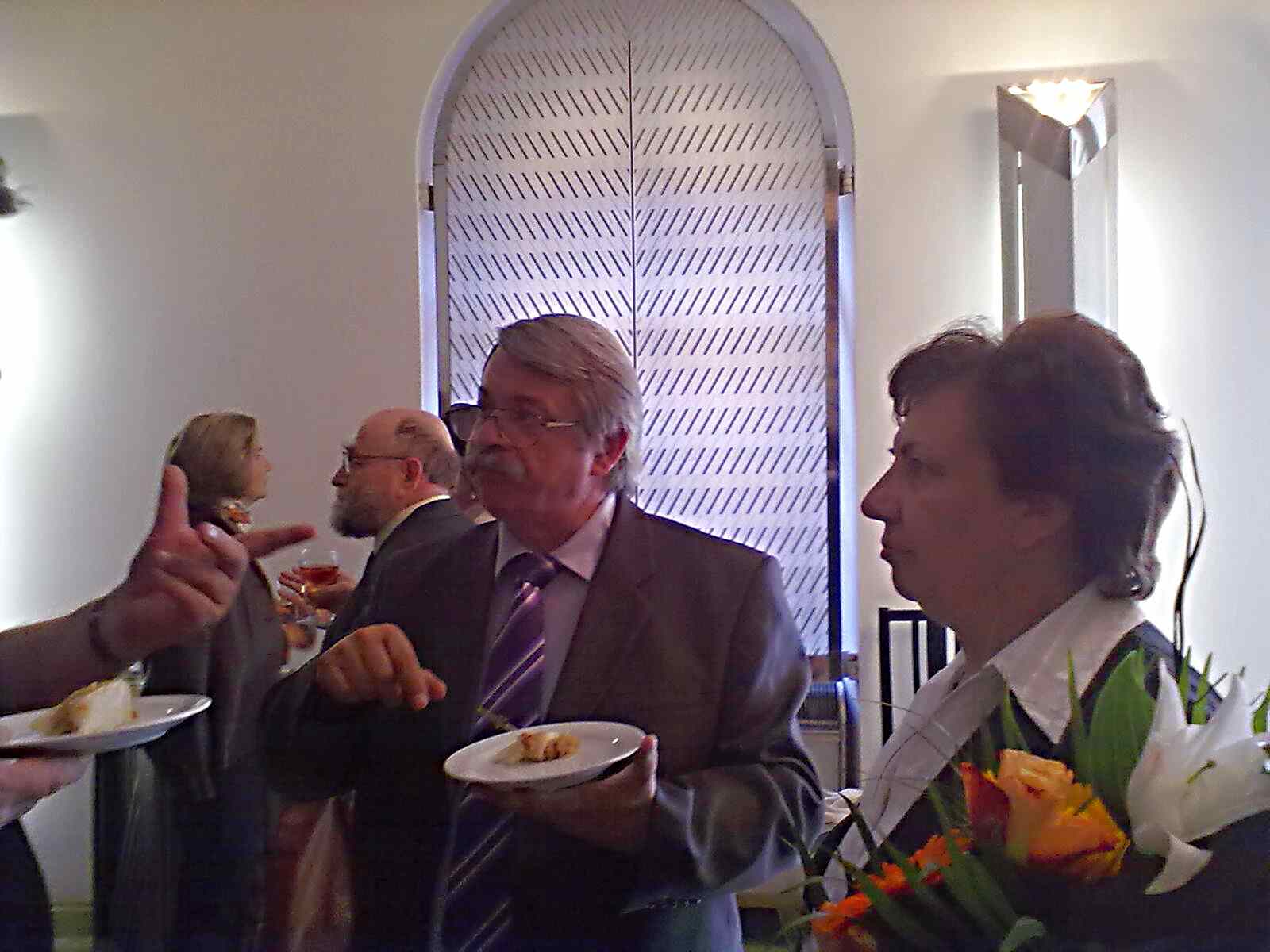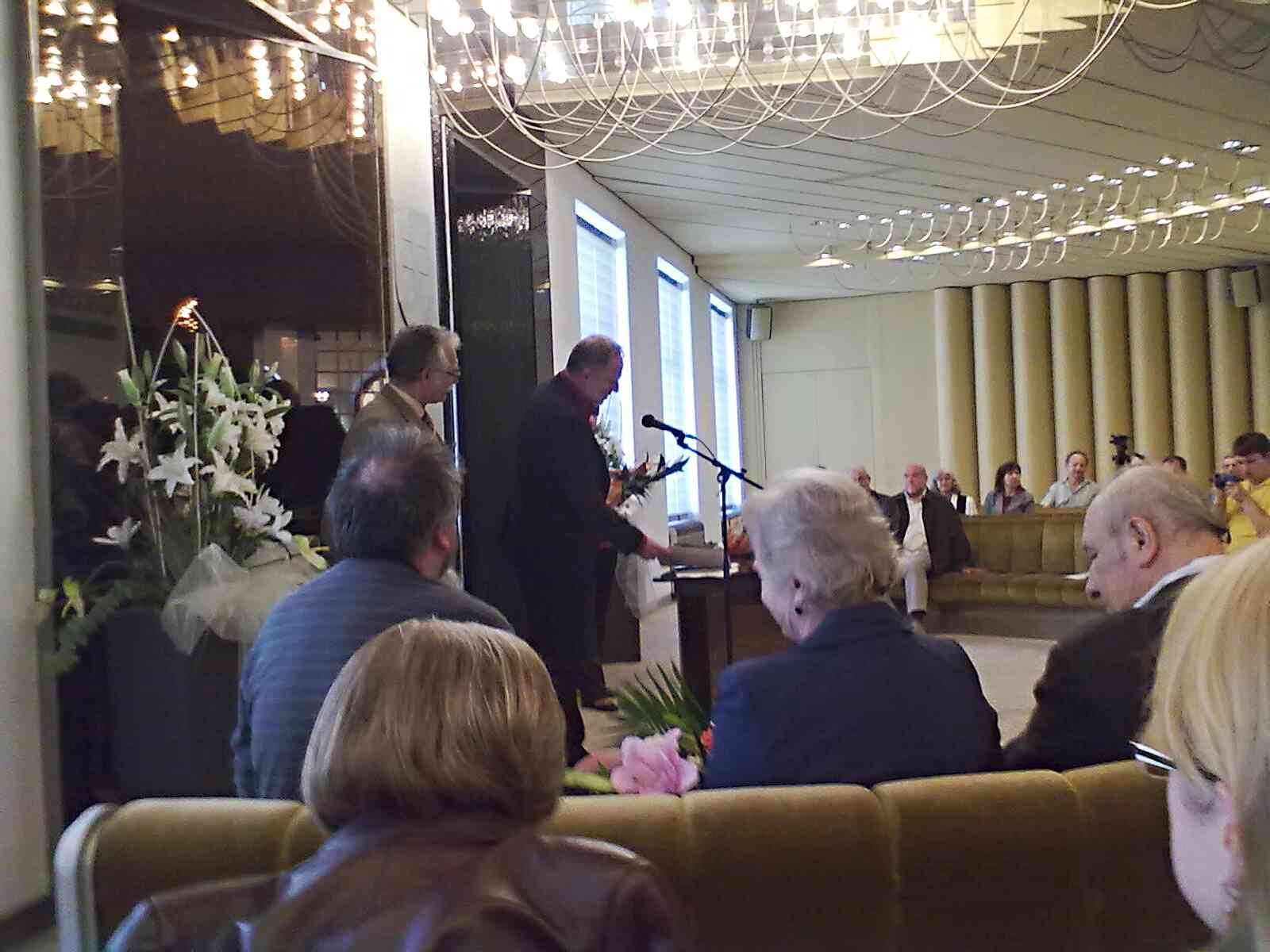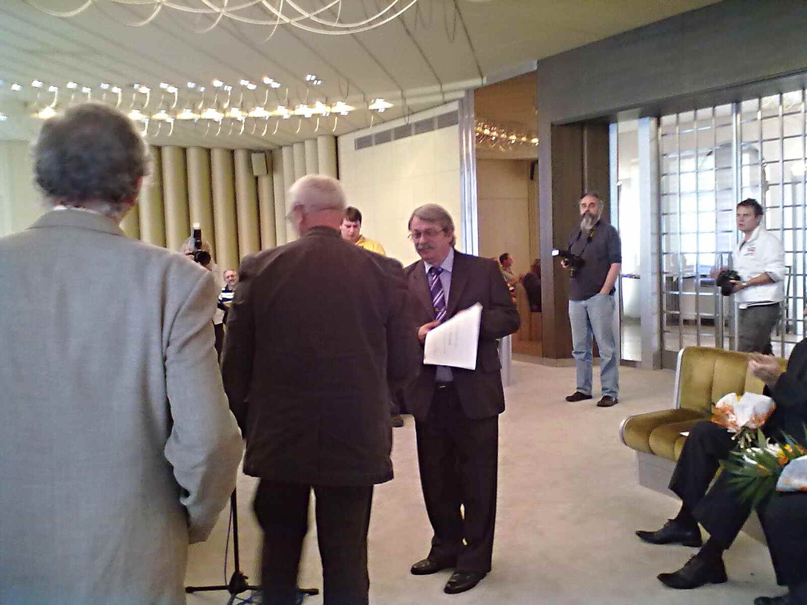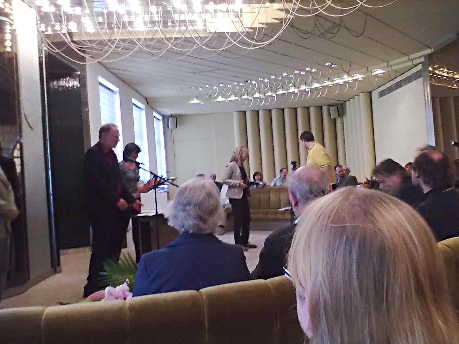 Po odovzdaní všetkých ocenení a gratuláciách sa prítomným prihovoril okrem predsedu rady prof. Bokesa aj súčasný riaditeľ hudobného fondu Mgr. Matúš Jakabčic, ktorý vyzdvihol najmä tú skutočnosť, že hudobný fond v súčasnosti ako jediný udeľuje každoročne ceny aj s finančným ohodnotením celkom v 6 žánroch hudby a interpretačného umenia a vyjadril nádej, že to aj pri stále nových a nových zmenách i zásahoch do poslania fondov tento trend zostane zachovaný pre podporu slovenskej hudobnej tvorby a interpretačného umenia. Potom vyzval zúčastnených k malému občerstveniu a ku gratuláciám a osobným rozhovorom s ocenenými a aj k ich spoločnej fotografii. My sme zostali s Milom ešte pár vzácnych chvíľ v rozhovore a podnetných nápadoch a potom sme sa rozišli každý po svojich povinnostiach.