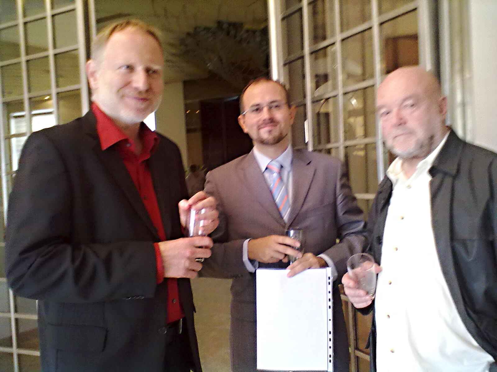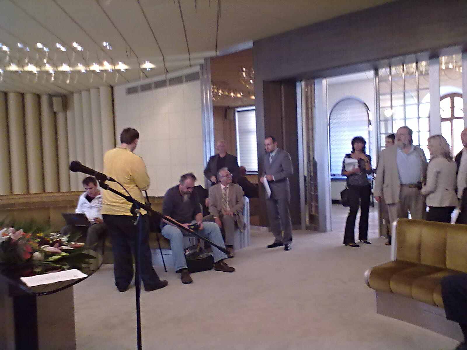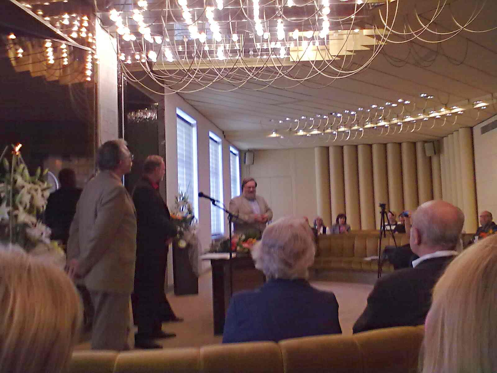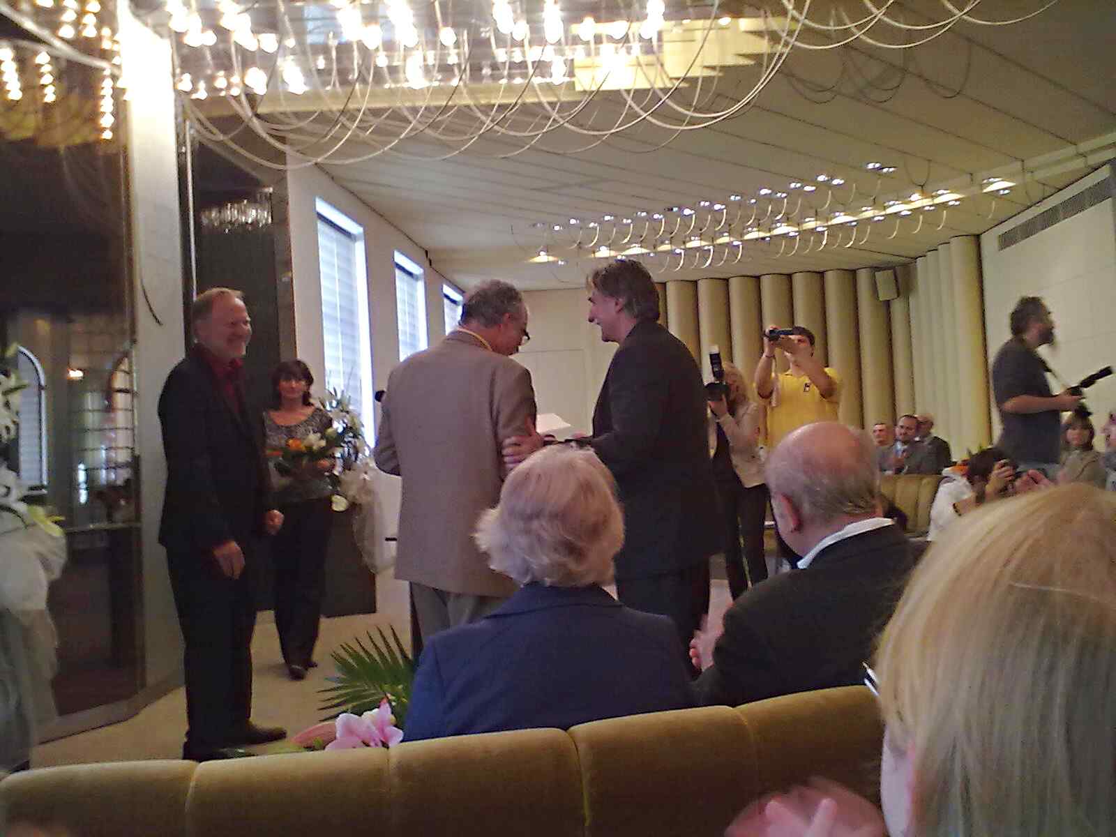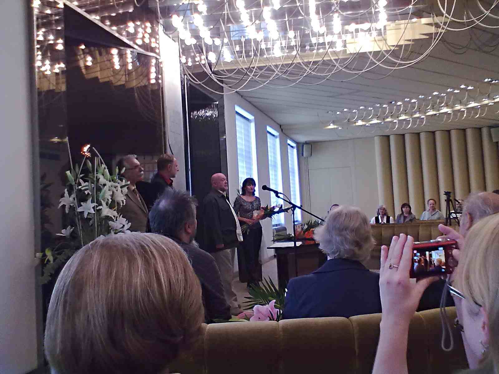 Po odovzdaní všetkých ocenení a gratuláciách sa prítomným prihovoril okrem predsedu rady prof. Bokesa aj súčasný riaditeľ hudobného fondu Mgr. Matúš Jakabčic, ktorý vyzdvihol najmä tú skutočnosť, že hudobný fond v súčasnosti ako jediný udeľuje každoročne ceny aj s finančným ohodnotením celkom v 6 žánroch hudby a interpretačného umenia a vyjadril nádej, že to aj pri stále nových a nových zmenách i zásahoch do poslania fondov tento trend zostane zachovaný pre podporu slovenskej hudobnej tvorby a interpretačného umenia. Potom vyzval zúčastnených k malému občerstveniu a ku gratuláciám a osobným rozhovorom s ocenenými a aj k ich spoločnej fotografii. My sme zostali s Milom ešte pár vzácnych chvíľ v rozhovore a podnetných nápadoch a potom sme sa rozišli každý po svojich povinnostiach.