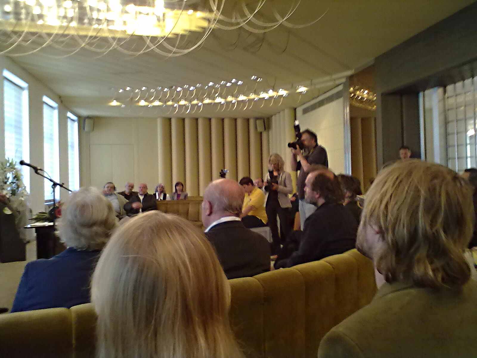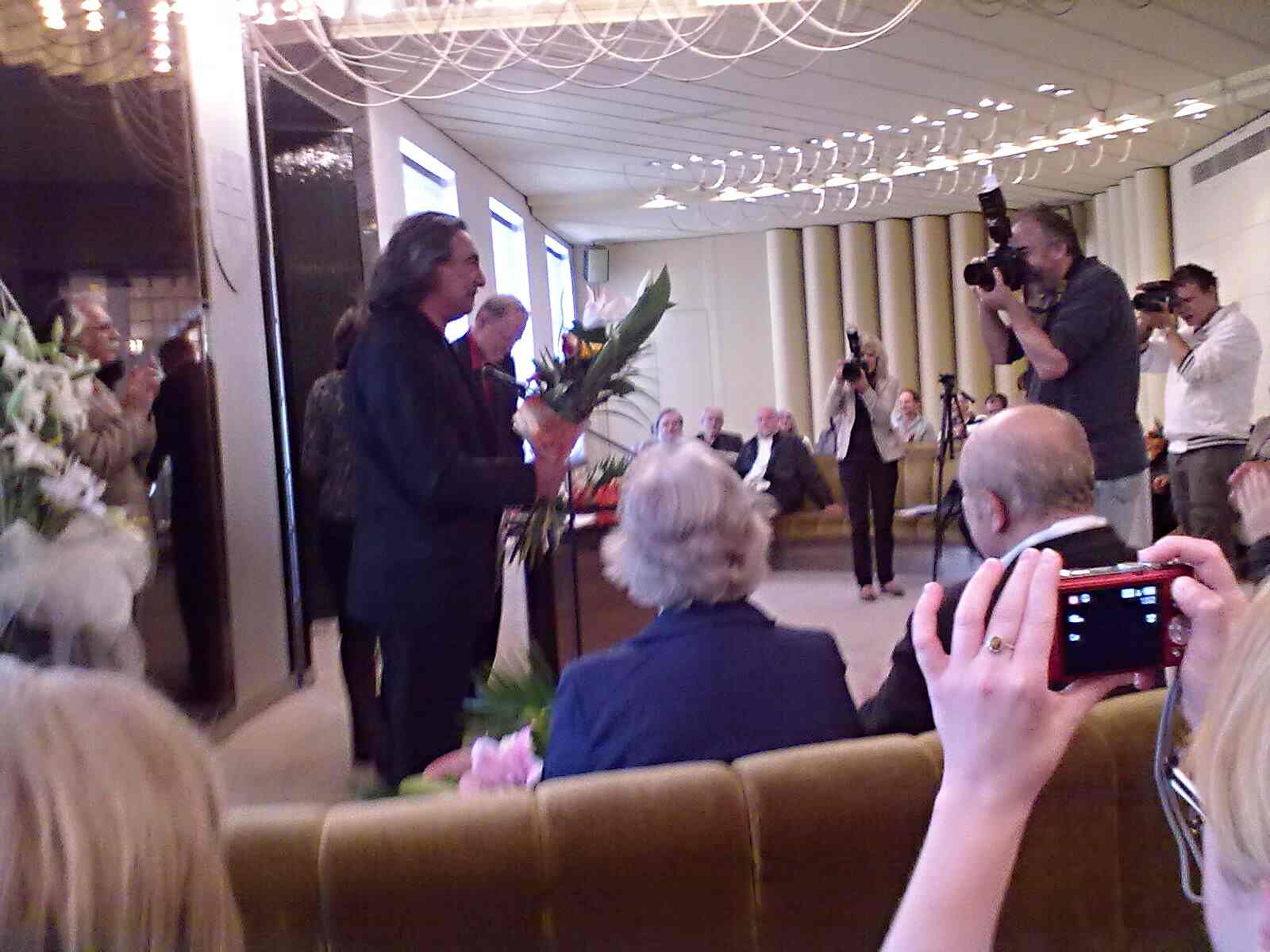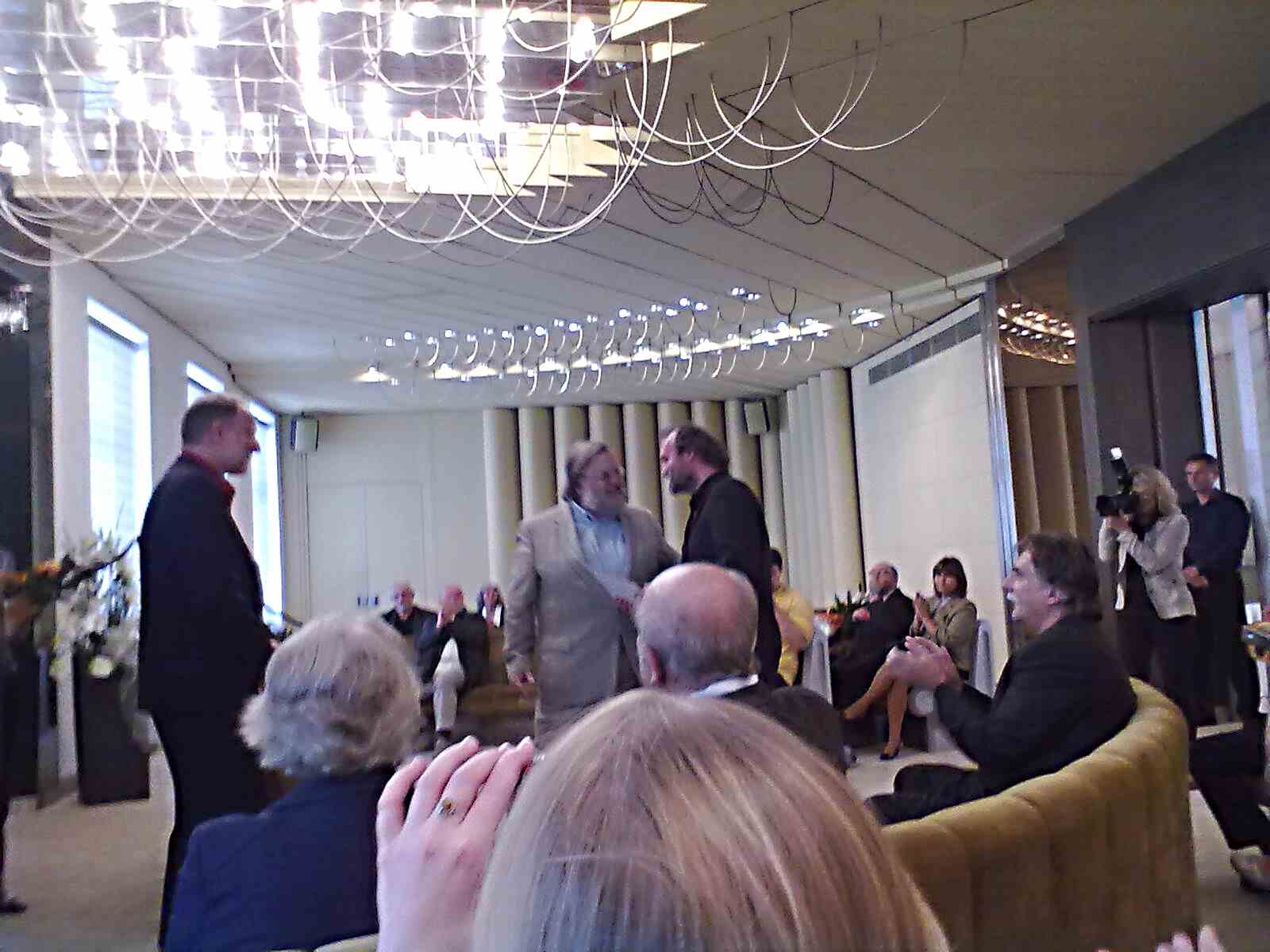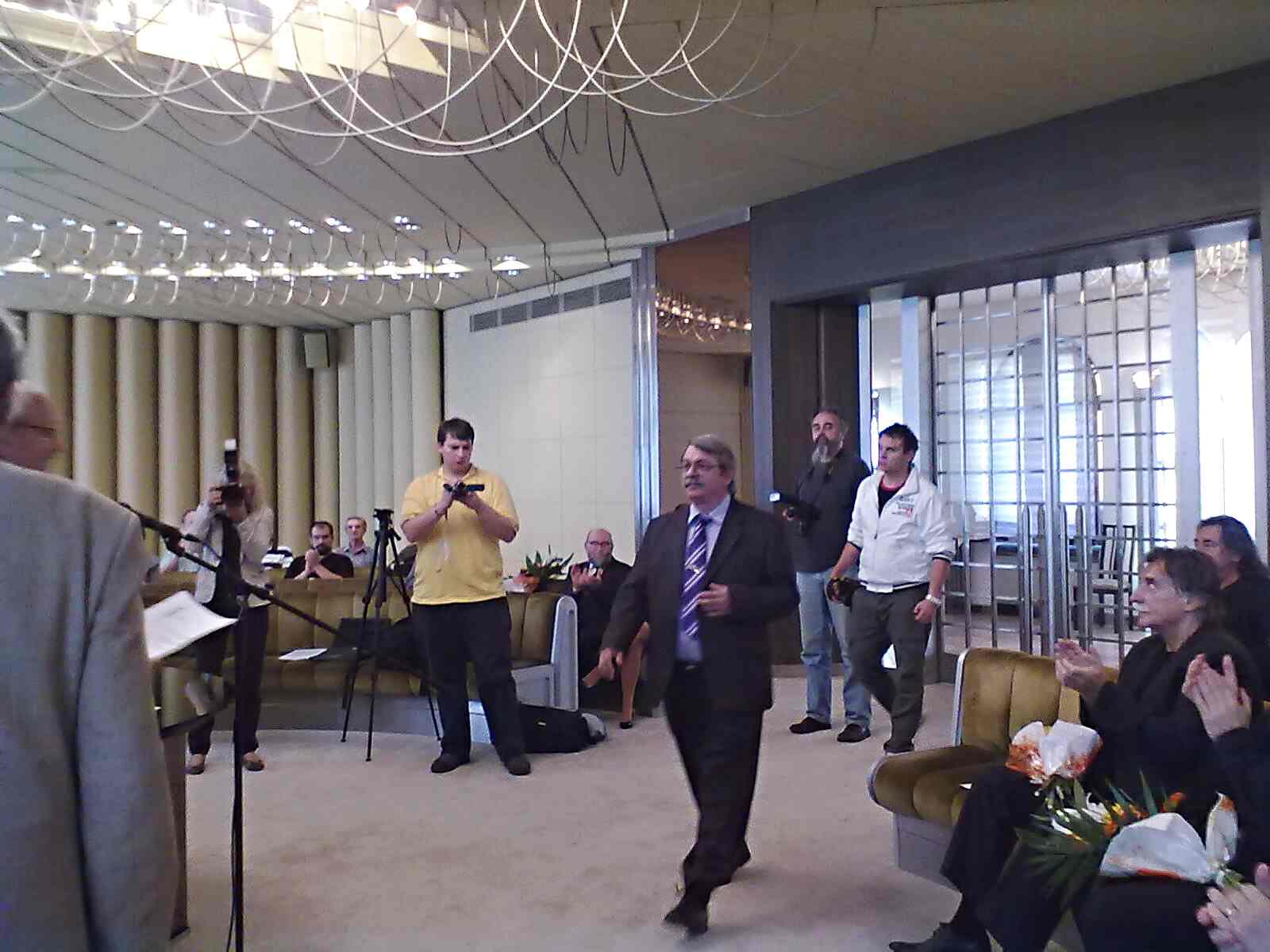Po odovzdaní všetkých ocenení a gratuláciách sa prítomným prihovoril okrem predsedu rady prof. Bokesa aj súčasný riaditeľ hudobného fondu Mgr. Matúš Jakabčic, ktorý vyzdvihol najmä tú skutočnosť, že hudobný fond v súčasnosti ako jediný udeľuje každoročne ceny aj s finančným ohodnotením celkom v 6 žánroch hudby a interpretačného umenia a vyjadril nádej, že to aj pri stále nových a nových zmenách i zásahoch do poslania fondov tento trend zostane zachovaný pre podporu slovenskej hudobnej tvorby a interpretačného umenia. Potom vyzval zúčastnených k malému občerstveniu a ku gratuláciám a osobným rozhovorom s ocenenými a aj k ich spoločnej fotografii. My sme zostali s Milom ešte pár vzácnych chvíľ v rozhovore a podnetných nápadoch a potom sme sa rozišli každý po svojich povinnostiach.
