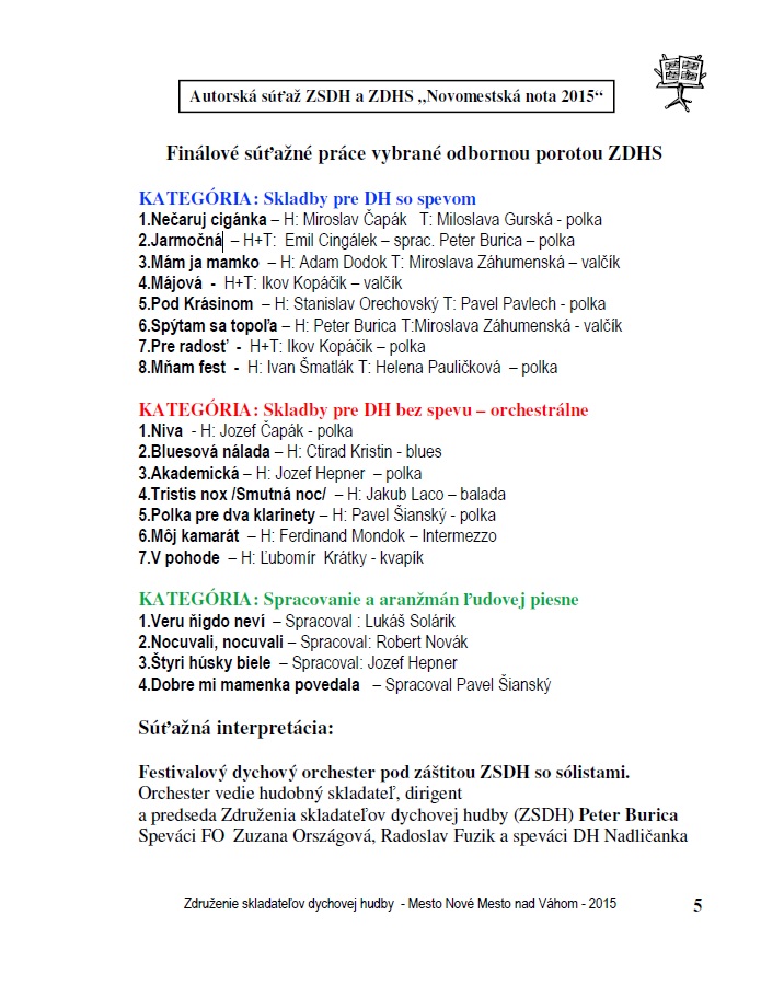 Dňa 19. 9. 2015 sa na hlavnej tribúne Novomestského jarmoku uskutočnil 18. ročník festivalu dychových hudieb s názvom Novomestská nota. Festival je už 8. rok spojený s celoslovenskou autorskou súťažou skladieb pre dychové hudby. Organizátormi podujatia boli: Združenie skladateľov dychovej hudby, Mesto Nové Mesto nad Váhom, Združenie dychových hudieb Slovenska, Národné osvetové centrum Bratislava a Hudobný fond Bratislava.