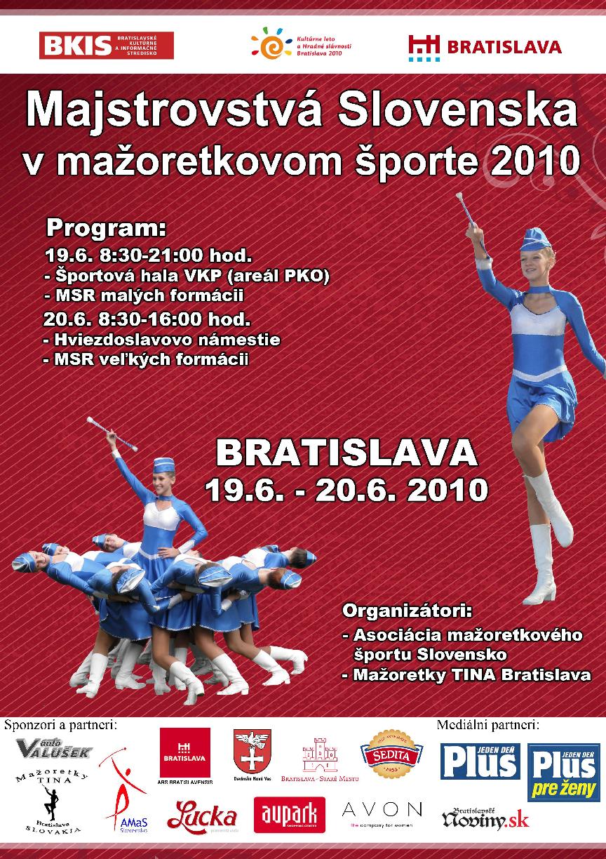 Mažoretky TINA Bratislava ako spoluorganizátor významného podujatia Majstrovstiev Slovenska v mažoretkovom športe 2010 Vás srdečne pozývajú na toto podujatie a tešia sa na Váš záujem a podporu tejto určite zaujímavej prehliadky radosti z pohybu, majstrovstva v kreáciách a ladnej prirodzenej krásy slovenských mažoretiek všetkých kategórií. Vitajte na tomto podujatí, vaše potlesky sú pre nás odmenou i povzbudením do ďalších nácvikov. Prajeme Vám nezabudnuteľný zážitok roka 2010. ( mažoretky celého Slovenska ).
