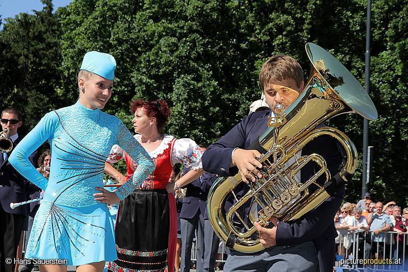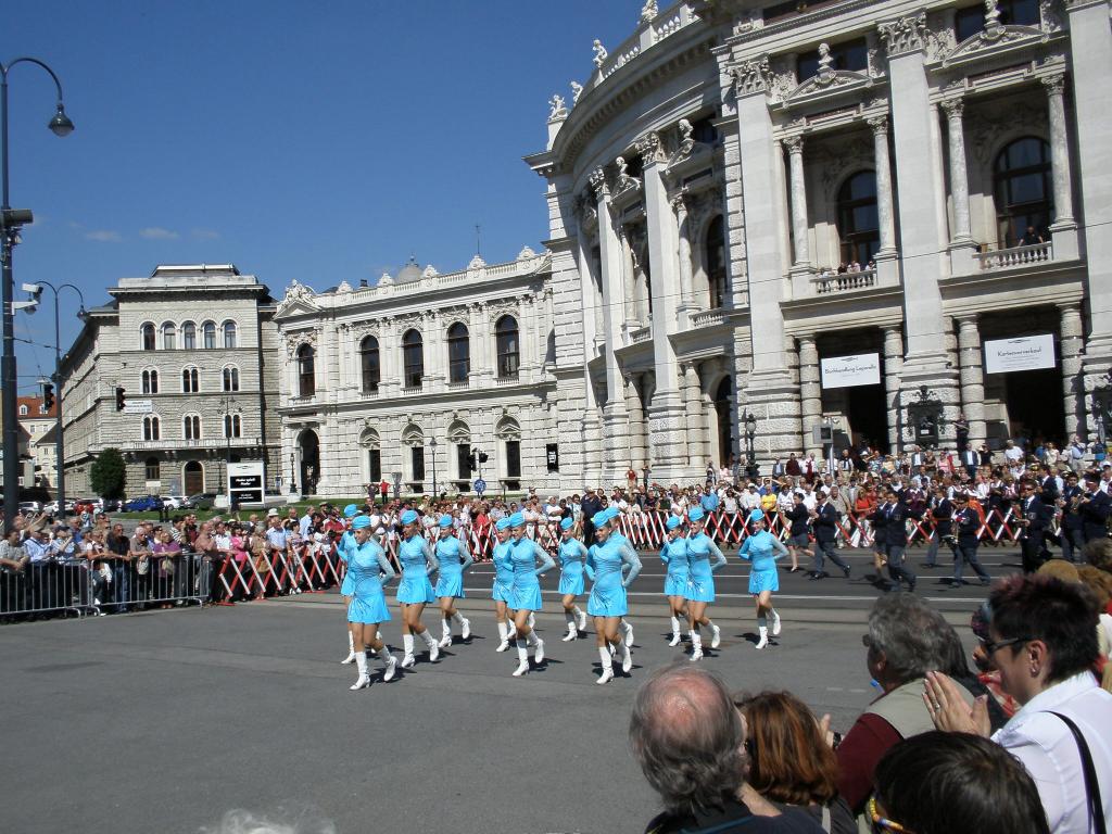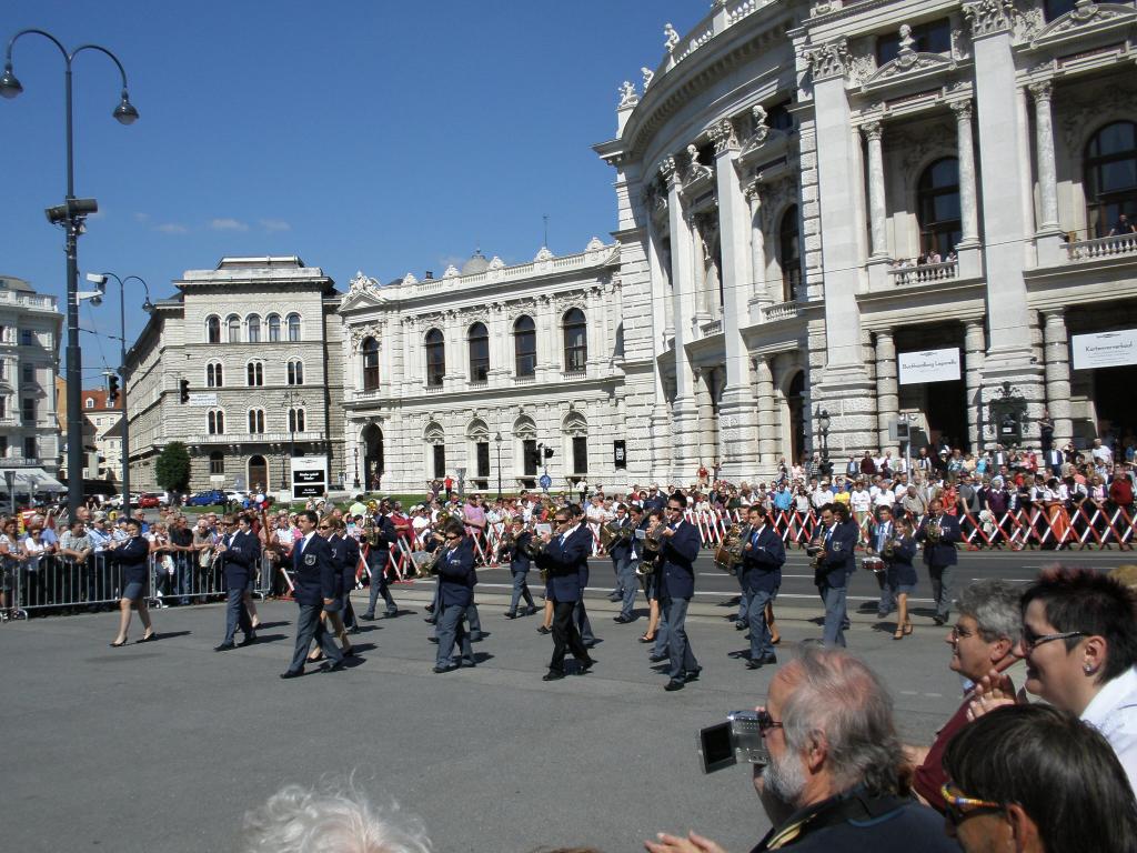 Popoludní program pokračoval na Námestí Hrdinov (Heldenplatz). Tu sa konala opäť zhrávka na spoločný koncert. A potom to začalo. Odtiaľto vypochodovali všetky kapely smerom k radnici. Ulice lemované stovkami divákov podporovali všetkých muzikantov a dodávali im silu pochodovať v tridsať stupňovej horúčave. Ako prvé vyšli do ulíc Viedne rakúske súbory reprezentujúce každá svoj kraj (Südtirol, Burgenland, Kärnten, Niederösterreich, Oberösterreich, Salzburg, Steiermark, Tirol, Vorarlberg, Wien). Každá z týchto kapiel bola tvorená zoskupením troch súborov, teda veľký počet muzikantov a ešte väčší zvuk. Následne nastupovali kapely z Nemecka a Lichtenštajnska. A potom nasledovali baby z Tiny a za nimi my. Pochod mažoretiek na piesne hrané Bánovčankou rozveselil pohľad každého prítomného v publiku a potlesk bol z kroku na krok silnejší. A tak sme sa blížili k radnici a k pódiu, na ktorom boli prítomní všetci čelní predstavitelia mesta Viedeň, a ktorých sme mali ako jediný pobaviť akýmsi šouprogramom, nakoľko všetky predošlé kapely iba prešli okolo nich a ukázali svoje umenie v pochodovaní. Priebeh tohto nášho vystúpenia skrsol v hlave pána Adama Hudeca, ktorý sem Bánovčanku i Tinu dostal. V Devínskej Novej Vsi sa jednu peknú aprílovú nedeľu nacvičil a teraz 5.6.2010 bol ten správny čas ukázať všetkým, čo sme nacvičili a byť ešte lepší ako na skúške. „Šou“ začala tancom mažoretiek na Pádivého Slovenský pochod. Celé osadenstvo tribúny išlo oči nechať na pekných slovenských devách. Následne skladba prešla do Virtuóznej polky a sólista na klarinete začal svojou hrou „baliť“ hlavnú mažoretku, tá nie a nie sa mu oddať a v tom prišiel na rad ďalší záujemca o túto krásavičku a to sólista na tube v Ondrej polke. Akési hudobné prekáračky dvoch súperov si všimla „mama“ a tá chlapcov rozohnala čo najďalej od svojej dcérušky. A to už nasledoval Slovanský pochod a dotancovanie choreografie mažoretkami a následne obrovský potlesk, smiech a nadšené tváre tribúny a prítomných a cvakanie fotoaparátov. Za búrlivého potlesku sme pokračovali ďalej k radnici na Rathausplatz a čakali na záverečný koncert, nakoľko za nami ešte pochodovala kapela z Maďarska a domáca Gardemusik Wien (posádková hudba).
