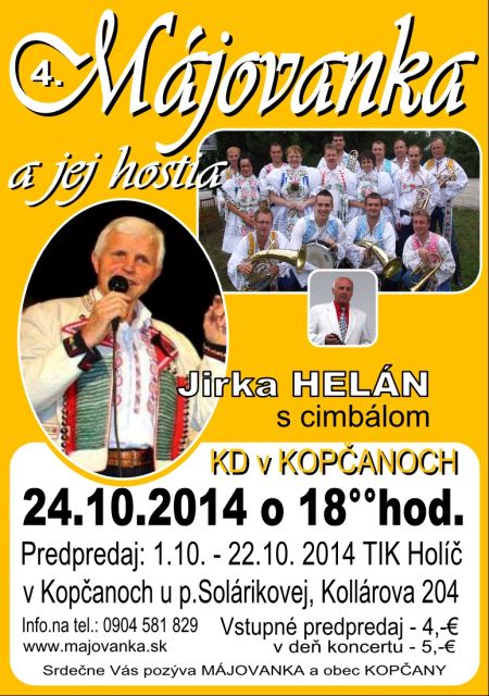 MÁJOVANKA Vás srdečne pozýva na koncert do kultúrneho domu v KOPČANOCH dňa 24.10.2014 o 18°°hod. Hosťom tejto záhoráckej kapely, na štvrtom pokračovaní seriálu koncertov, bude známy spevák, muzikant, skladateľ a rozhlasový moderátor Jiří HELÁN s cimbálom. Tento rodák z Veverskej Bitýšky pôsobil ako spevák s Moravankou a dlhé roky s brnenskou MORAVĚNKOU.