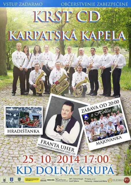 Srdečne pozývame všetkých milovníkov a priateľov dychovej hudby na krst prvého CD DH Karpatská kapela, pod názvom "V tej našej dedinke". Program začína o 17-tej hodine v kultúrnom dome v Dolnej Krupej. Ako prvá sa predstaví DH Hradišťanka,pokračovať bude domáca Karpatská kapela, ktorá po koncerte pokrstí svoje prvé CD. Počas celého programu nebude chýbať sprievodné slovo známeho moderátora, ľudového rozprávača a speváka z Lanžhota - Franta Uher. Do tanca a zábavy bude pripravená  DH Májovanka. Už teraz sa na Vás všetkých veľmi tešíme. DH Karpatská kapela.