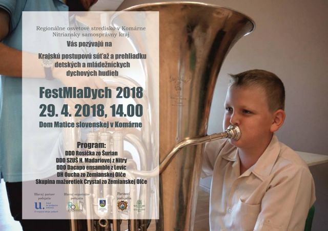 Regionálne osvetové stredisko v Komárne organizuje dňa 29. apríla 2018 Krajskú postupovú súťaž a prehliadku detských a mládežníckych dychových hudieb FestMlaDych 2018 v Dome Matice slovenskej v Komárne. Podujatie sa začne o 13:00 hod. vystúpením hosťujúcej dychovej hudby Oucha a skupinou mažoretiek Crystal zo Zemianskej Olče pred Domom Matice slovenskej. Súťaž odštartujeme o 14:00 hod. vystúpením DDO Dacapo ensamble z Levíc, DDO SZUŠ Heleny Madariovej z Nitry a DDO Rosička zo Šurian. Na záver podujatia nám zahrá DH Oucha zo Zemianskej Olče.