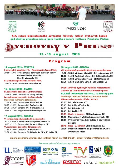 Všetko čo sa každoročne počas štvordňového festivalu udeje, majú ,,na svedomí“ organizátori Dychová hudba Cajlané, Pezinské kultúrne centrum a Fanklub DH Cajlané, ktorí pre Vás opäť pripravili sviatočné dni s dychovou hudbou, a to na 15. až 18. augusta 2019.