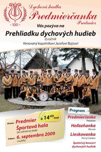 Pozývame všetkých priaznivcov dychovej hudby v nedeľu 6. septembra 2009 z blízkeho, či ďalšieho okolia na zahajovací 0. ročník festivalu dychových hudieb venovaný kapelníkovi Jozefovi Bajzovi o 14:00 hod do športovej haly v Predmieri. Buďte nám všetci srdečne vítaní.