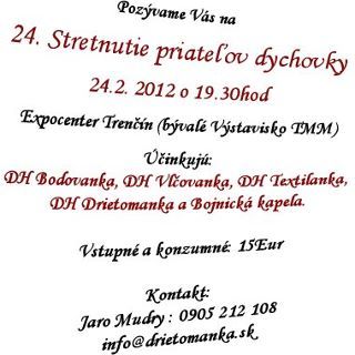 Srdečne Vás pozývame na 24.Stretnutie priateľov dychovky, ktoré sa uskutoční 24.2.2012 o 19:30 v EXPO Center (bývalé Výstavisko TMM) Trenčín. Účinkujú: DH Vlčovanka, DH Textilanka, DH Bodovanka, DH Drietomanka a Bojnická kapela.