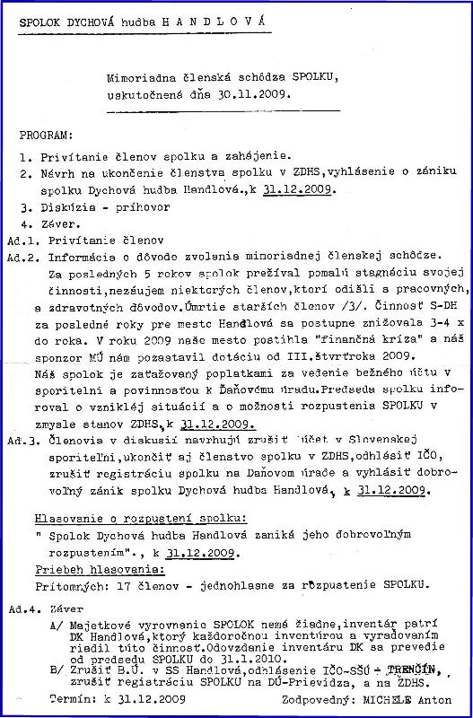Dňa 25.1.2010 bolo doručené ústrediu ZDHS rozhodnutie spolku DH HANDLOVÁ o zániku spolku jeho dobrovoľným rozpustením na základe uznesenia mimoriadnej schôdze spolku dňa 30.11.2009. Súčasne boli dodané aj všetky potrebné dokumenty o zrušení účtu, IČA a hlásenia DÚ, MsÚ,a rozhodnutím o majetkovom vysporiadaní. Tiež bol odovzdaný preukaz spolku DH. Združenie dychových hudieb Slovenska berie na vedomie rozhodnutie členov v súlade zo stanovami ZDHS a chápe podmienky súčasného stavu spolku, ktoré viedli k tomuto rozhodnutiu. Spolok má všetky svoje povinnosti vôči ZDHS splnené. Ďakujeme spolku DH Handlová za doterajšiu zodpovednú a prospešnú činnosť pre dychovú hudbu vo svojom regióne a na Slovensku Osobitne chceme poďakovať predsedovi spolku p. Antonovi Michelemu o úprimnú snahu riešiť zložitú situáciu DH v Handlovej a za jeho dlhoročnú prácu pre DH v regióne. (predstavenstvo ZDHS).